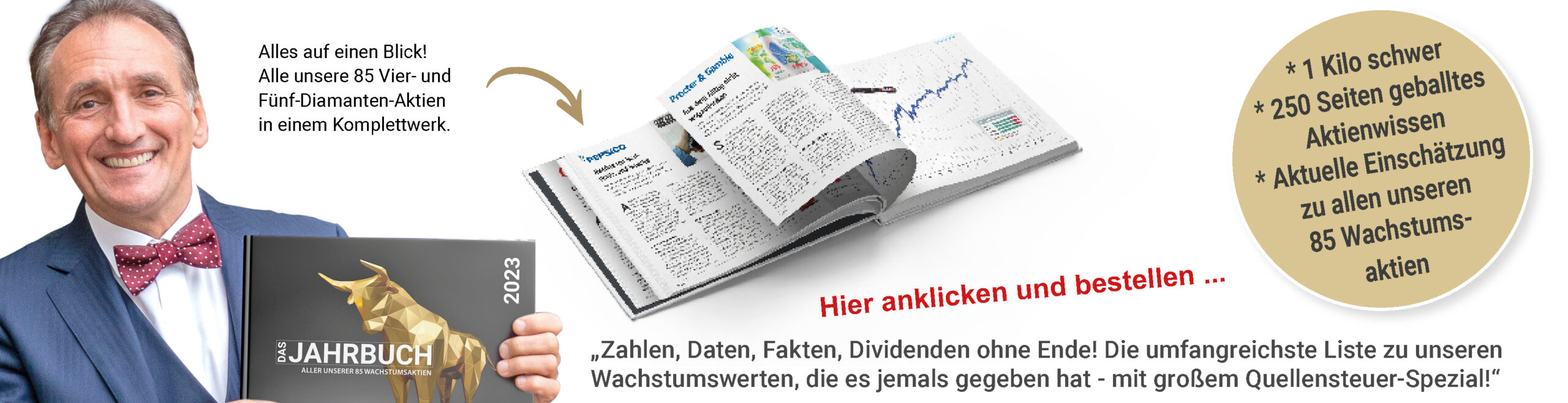 Joachim Brandmaier (61): „Unfassbar viele Bestellungen sind bei uns für das über 1 Kilo schwere Jahrbuch 2023 aller unserer 85 Wachstumsaktien eingegangen. Vielen Dank auch für ihre viele positiven Zuschriften (siehe etwas weiter unten), die Begeisterung über den “dicken Schinken” bei unseren Lesern ist riesengroß.” Jedoch gehen die Exemplare jedoch langsam aber sicher zur Neige…