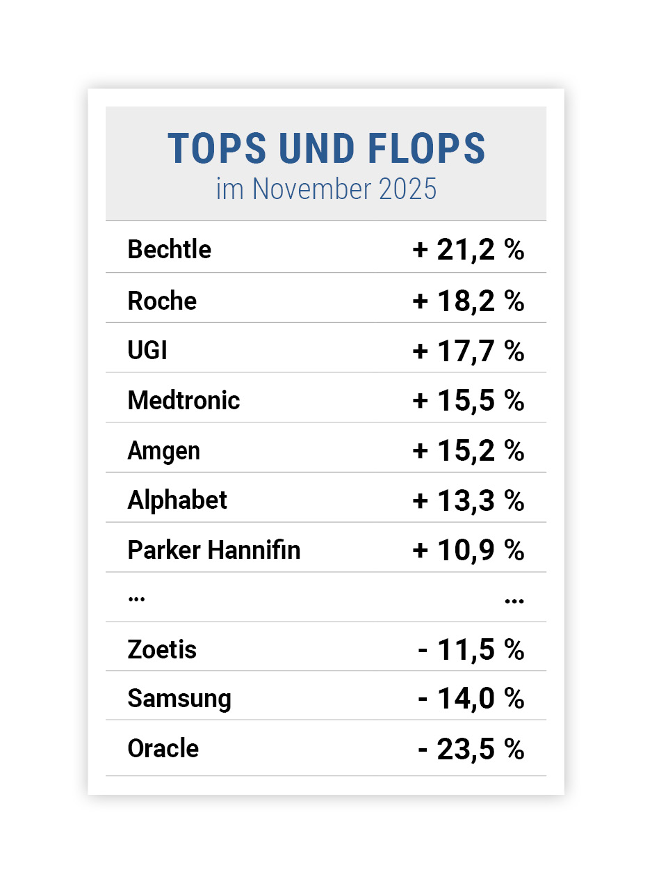 Spitzenreiter bei unseren Wachstumsaktien war der IT-Dienstleister Bechtle. Wie im Börsenticker berichtet ließ hier ein Großauftrag den Kurs anspringen. Bei Roche sorgten mehrere positive Medikamentenstudien für neuen Elan und UGI sowie Medtronic profitierten von den jüngsten Quartalszahlen.