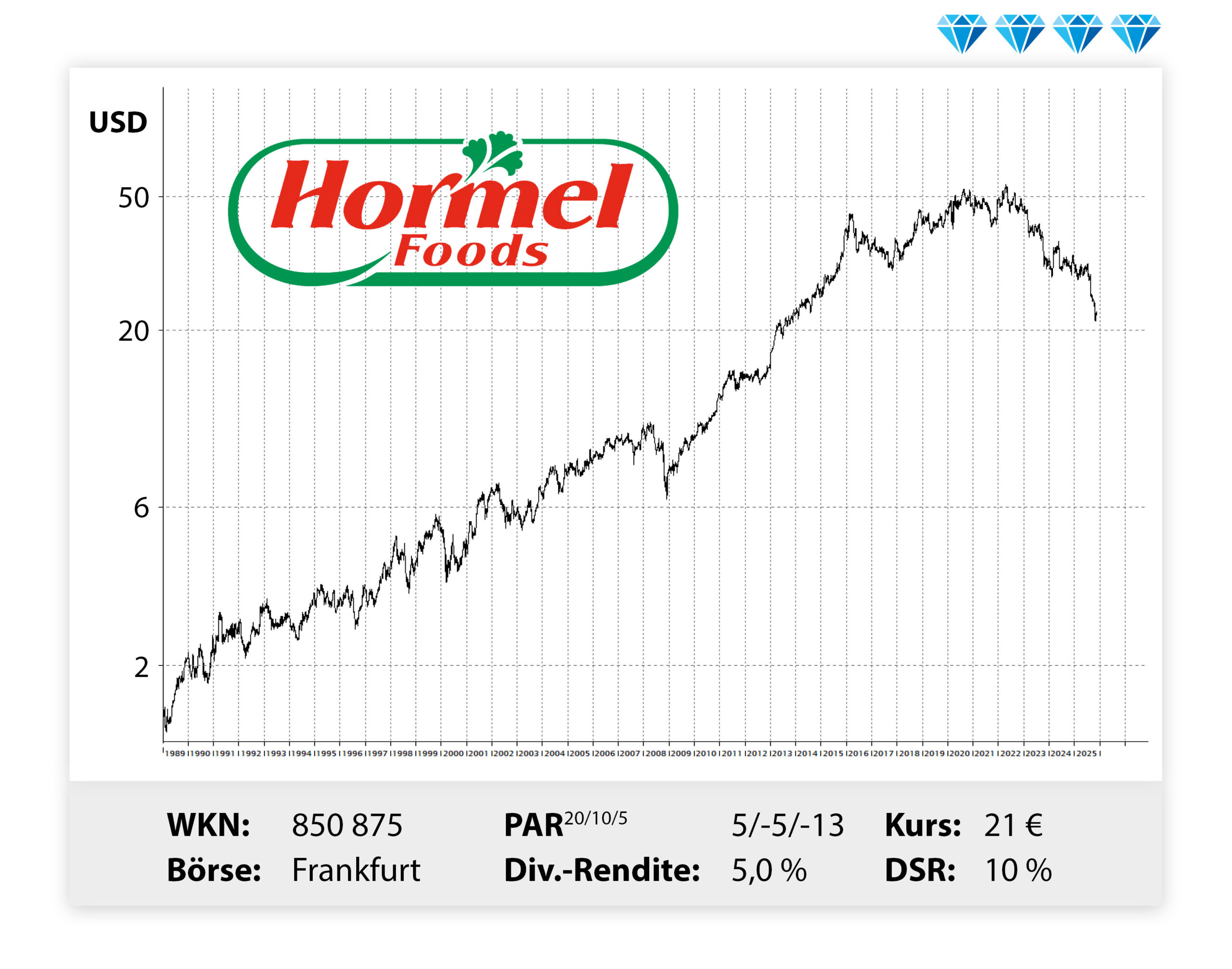 Hormel kämpfte zuletzt mit einer ganzen Reihe an Problemen. Neben gestiegenen Einkaufspreisen drückten die schwache Konsumlaune und Geflügelseuchen auf die Ergebnisse. Zu allem Übel sorgte auch noch ein Brand in einer Skippy-Erdnussbutterfabrik in Arkansas für Produktionsausfälle. Hormel hat neben verschiedensten Fleischprodukten und Würsten inzwischen auch pflanzliche Proteinquellen im Angebot, insbesondere Nusssnacks und eben Erdnussbutter. Wir drücken die Daumen, dass die Aktie das Schlimmste hinter sich hat!