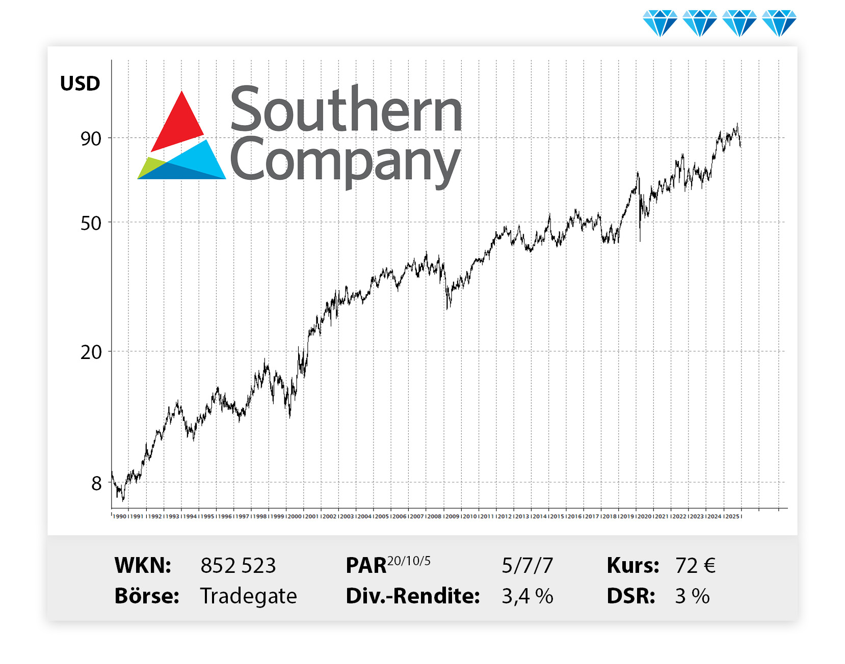 Ein Blick auf den Langfristchart: Der zieht beeindruckend nach oben, die durchschnittlichen Kurszuwächse liegen bei sieben Prozent pro Jahr (plus Dividende). Allerdings ist der Aufwärtstrend nicht ganz so sauber wie beispielsweise der einer Fünf-Diamanten-Aktie wie Air Liquide oder Stryker. Für die Kategorie „Vier-Diamanten-Aktien“ ist die Southern Company aber eine echte Bereicherung.
