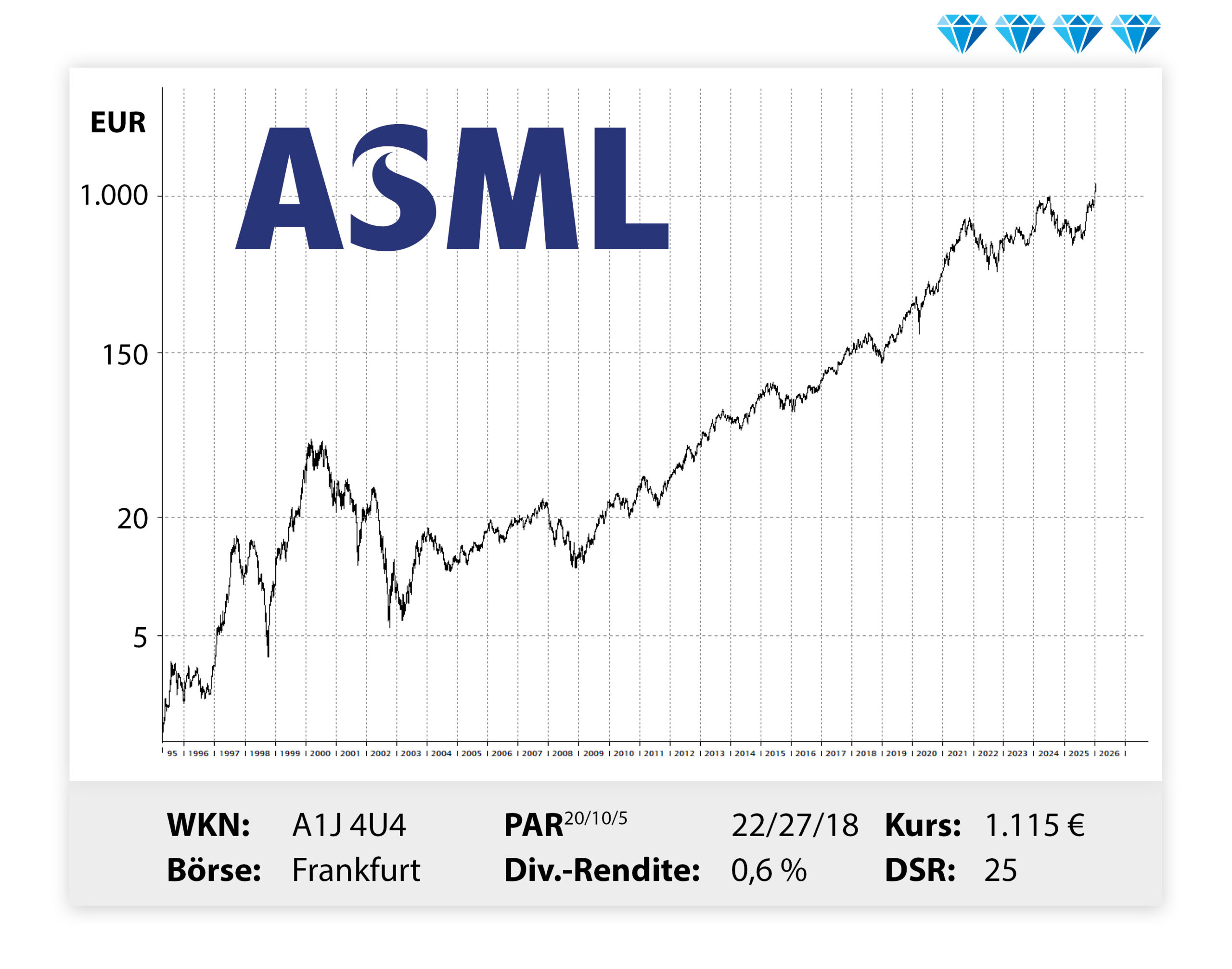 Keine drei Wochen ist es her, dass wir an dieser Stelle über die ASML-Aktie geschrieben und gemutmaßt haben, dass der Titel noch in diesem Jahr ein neues Allzeithoch erreichen könnte. Nun ging es deutlich schneller als gedacht: Die 1.000-Euro-Marke wurde bereits an den ersten Handelstagen des Jahres geknackt und anschließend ging es immer weiter nach oben. Mehr als 20 Prozent Kursplus haben sich damit 2026 bereits aufgetürmt. Unser niederländischer Wachstumskonzern profitiert dabei vom rasanten Wachstum im Chipsektor. Als Hersteller der riesigen Maschinen für die Halbleiterproduktion fungiert ASML quasi als Schaufellieferant in diesem modernen Goldrausch.