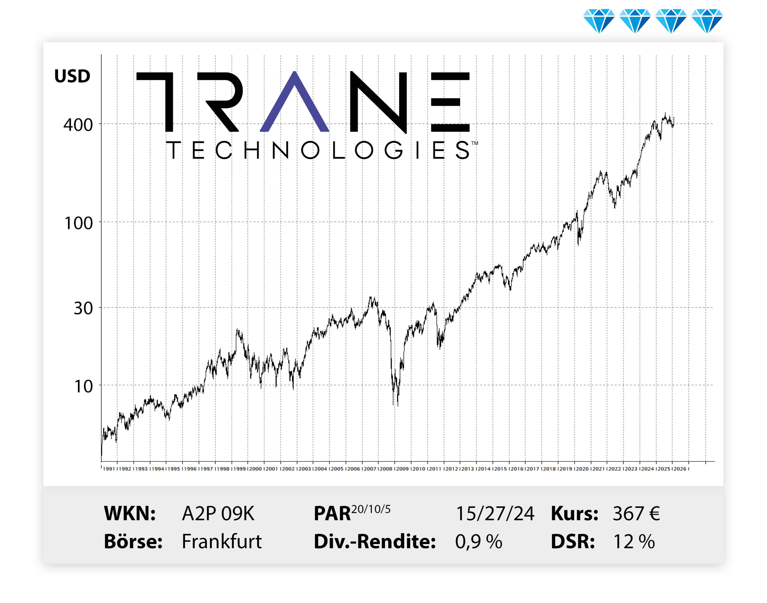 Nicht zuletzt dank der sprunghaft steigenden Nachfrage bei Kühllösungen für Datenzentren legte der Auftragsbestand im US-Geschäft mit kommerziellen Klimaanlagen im vierten Quartal um satte 35 Prozent zu. Trane-Aktionäre dürfen also weiter optimistisch nach vorne schauen. Größere Kursschwankungen sind zwar nicht ausgeschlossen – insbesondere, weil das Unternehmen seit einiger Zeit verstärkt als KI-Profiteur wahrgenommen wird –, langfristig spricht jedoch alles dafür, dass die Wachstumsgeschichte weitergeht. Und das gilt auch für die Dividende, die diese Woche um zwölf Prozent angehoben wurde: Ende März fließen deshalb erstmals 1,05 Dollar je Aktie und Quartal.