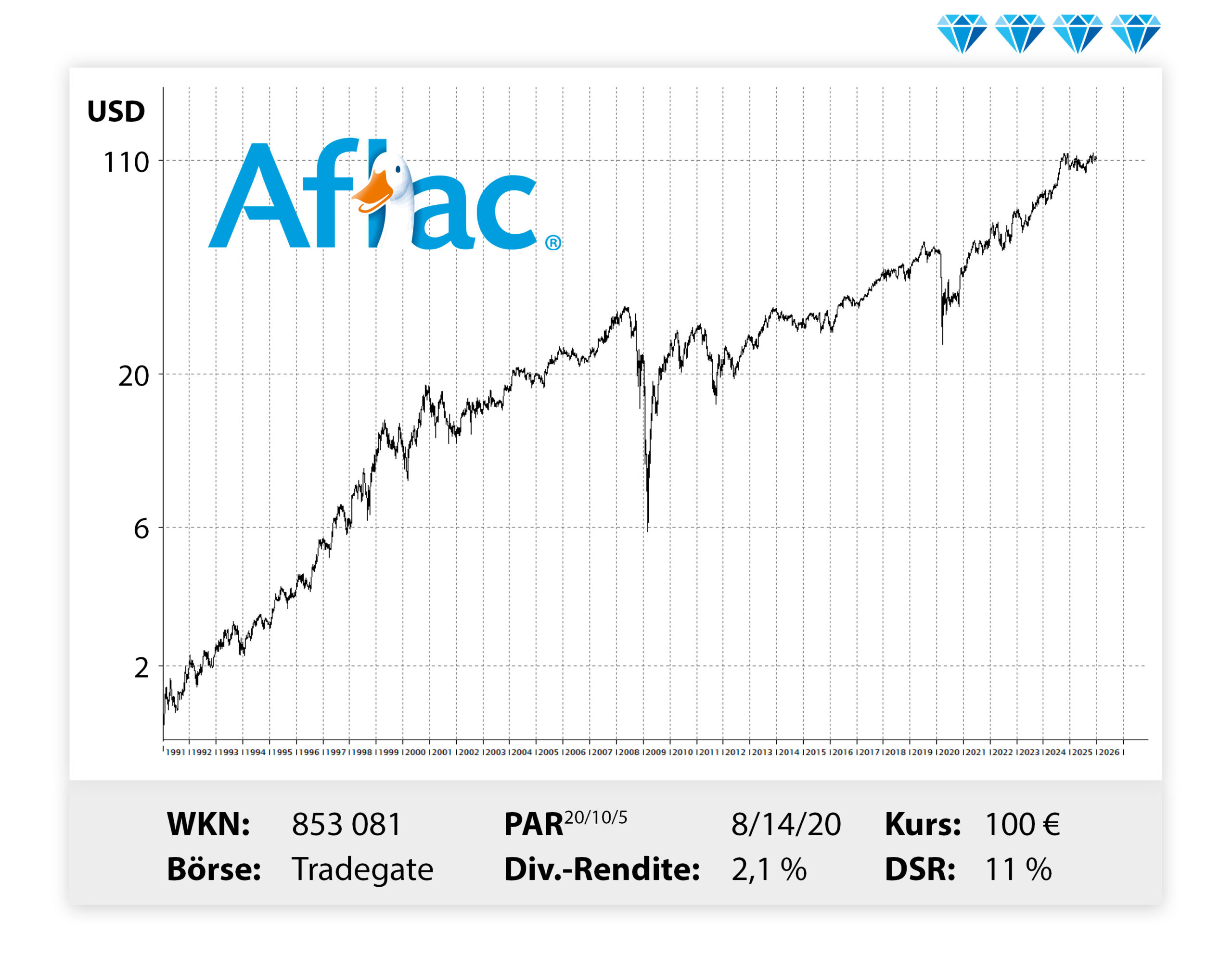 Beliebt ist die Aflac-Aktie auch bei Investoren, weil das Unternehmen mit der Ente („Aflac-Duck“) im Firmenlogo ein sehr verlässlicher Dividendenzahler ist: Seit über 50 Jahren schüttet der Versicherer ununterbrochen eine Gewinnbeteiligung an seine Anteilseigner aus und seit 43 Jahren in Folge wird diese ununterbrochen gesteigert. Wir sind überzeugt davon, dass sich ein Investment in Aflac auch künftig auszahlen sollte!