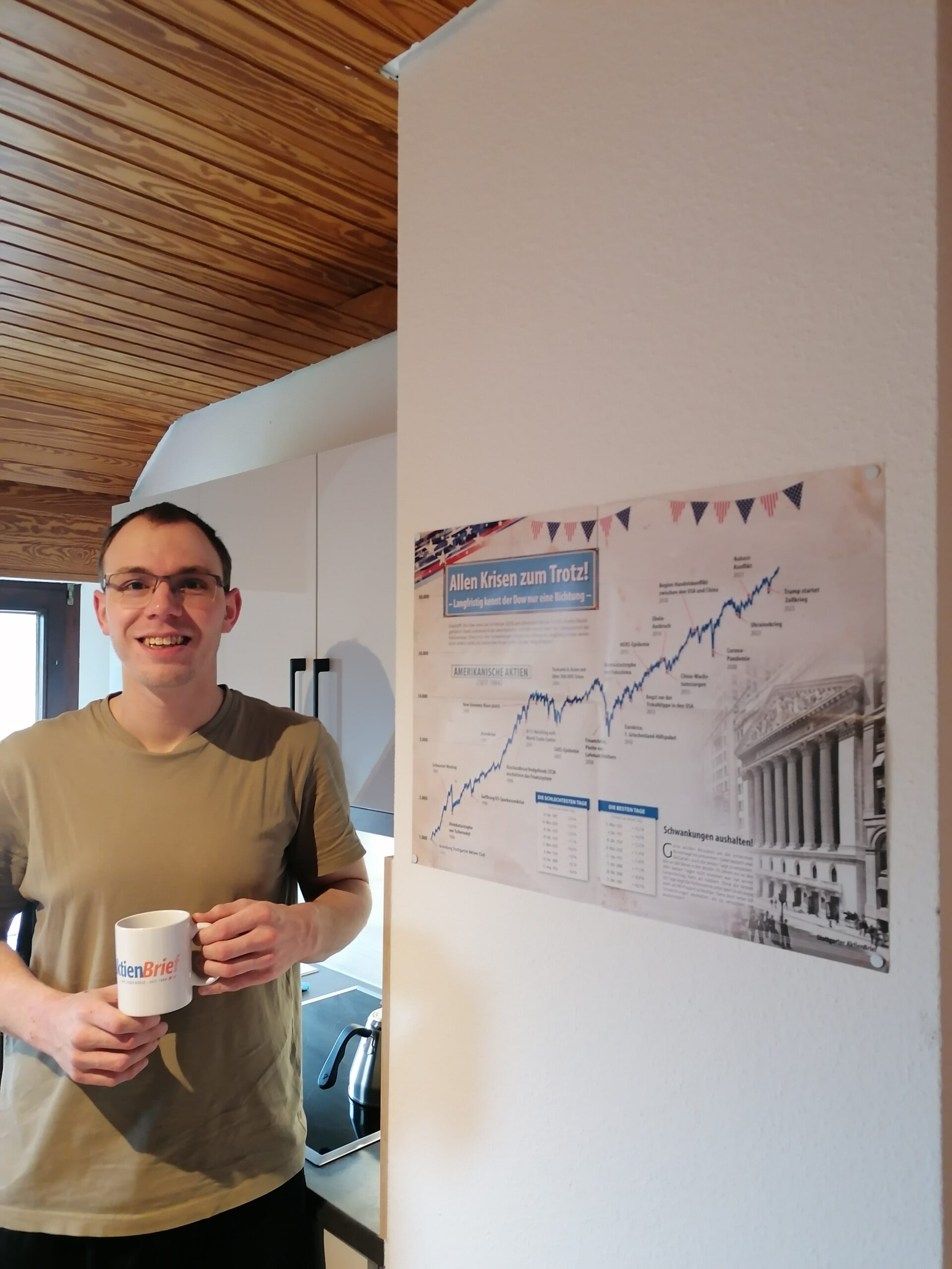 Guten Morgen Herr Brandmaier, anbei sende ich Ihnen mein Bild mit dem Wandplakat und mir. Ich habe ein schönes Plätzchen in der Küche gefunden. In Zukunft kann ich beim Frühstück mit der Aktienbrieftasse in der Hand, mit bestem Blick vom Tisch auf das Plakat mein Frühstück genießen. Auch wenn man mal morgens in sein Depot schaut und die Aktien Mal wieder gefallen sind, schaut man auf das Plakat und man wird sofort beruhigt, dass jede Krise auch eine Chance ist. Vielen Dank für das tolle Plakat. Gruß Fabian Stütz