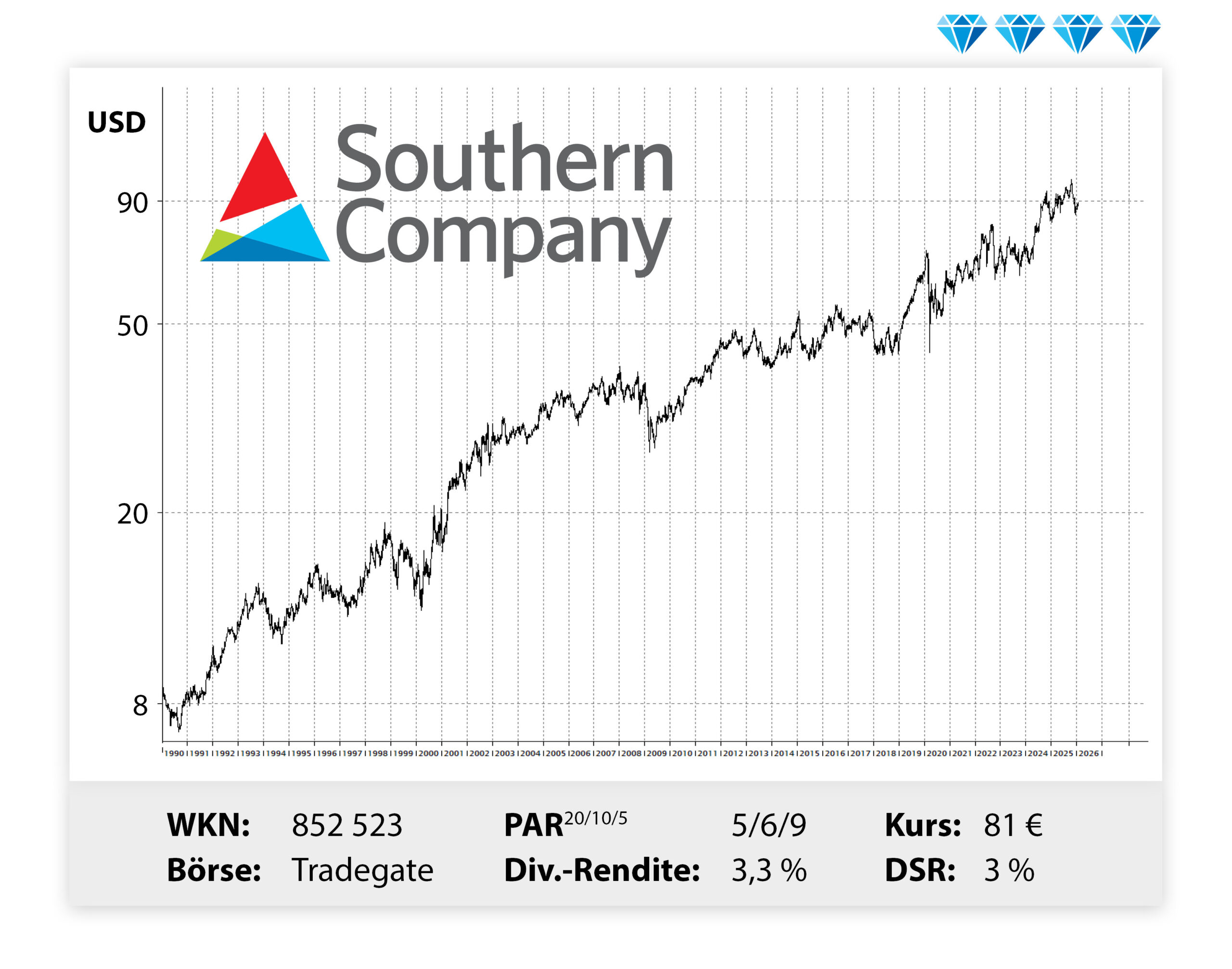 Vor wenigen Tagen hat unser neuer Vier-Diamanten-Titel Southern sein neues Investitionsprogramm für den Fünfjahreszeitraum 2026 bis 2030 vorgestellt. Anstatt der bislang veranschlagten 76 Milliarden Dollar sind nun sogar 81 Milliarden geplant. Schwerpunkte der Investitionen sind zum einen die Modernisierung der Stromnetze und zum anderen die Stromerzeugung. Southern reagiert damit auf die zunehmend extremer werdenden Wetterbedingungen, die speziell in den USA das Stromnetz immer öfter vor große Herausforderungen stellen. Gleichzeitig deckt man den stark steigenden Energiehunger der wie Pilze aus dem Boden sprießenden neuen Rechenzentren von Alphabet, Amazon, Microsoft & Co.