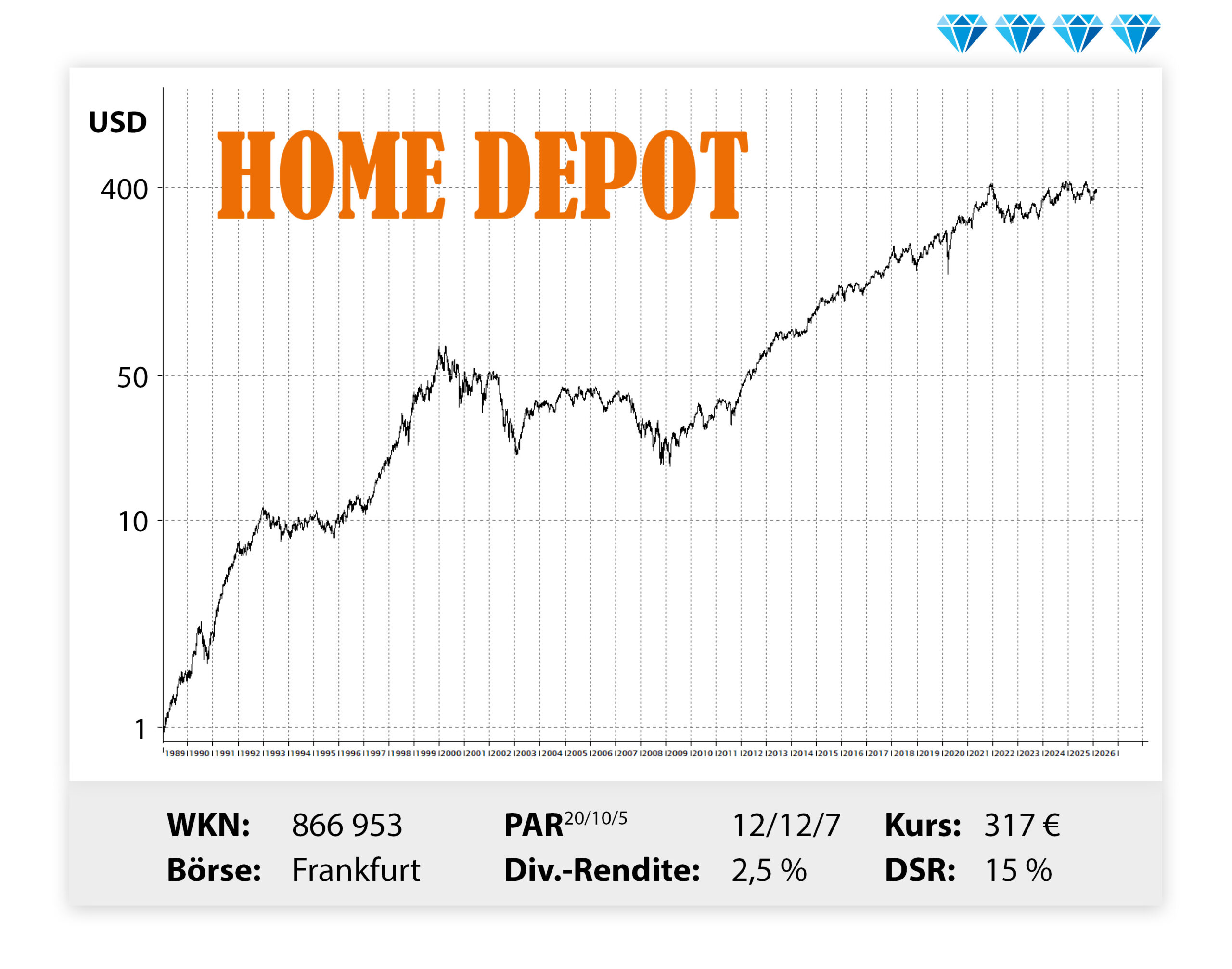 Im neu angelaufenen Jahr dürften Gewinn und Umsatz wieder steigen. Home Depot ist mit seinen 2.349 Niederlassungen die größte Baumarktkette der Welt, allerdings befinden sich die Filialen zu 100 Prozent in Nordamerika. 182 davon in Kanada, 140 in Mexiko, alle anderen in den USA. Diese Konzentration könnte sich als Vorteil erweisen, wenn Donald Trump seine geplante 200-Milliarden-Dollar-Spritze für den Immobilienmarkt setzt. Konkret will er durch den massiven Kauf von Hypothekenanleihen die Zinsen für Immobiliendarlehn senken und damit das Interesse am Hauskauf ankurbeln. Und wenn erst einmal ein Häuschen den Besitzer wechselt, dann führt erfahrungsgemäß der erste Gang des Käufers in den nächsten Home Depot, um sich mit entsprechendem Renovierungsmaterial auszustatten. Aber auch ohne Trumps Spritze bleibt die Aktie aussichtsreich, Zumal es sich hier um einen Dividendenaristokratenhandelt, der aktuell beim Einstieg bereits 2,5 Prozent Rendite bietet – Tendenz steigend!