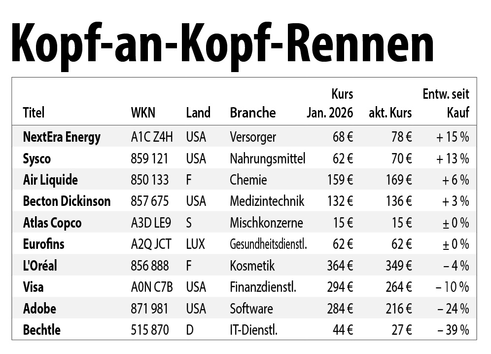 NextEra und Sysco bleiben an der Spitze unseres Musterdepots. Beide Werte konnten trotz der Börsenturbulenzen sogar noch leicht zulegen und notieren nicht weit entfernt von ihren Allzeithochs. Am Ende liegen mit Adobe und Bechtle nach wie vor unsere beiden Software-/IT-Titel. Die Stimmung für diesen Sektor ist immer noch gedrückt. Bei Bechtle hat sich vor allem der zurückhaltende Jahresausblick auf die Aktie niedergeschlagen, bei Adobe sind es KI-Sorgen. Wir sind aber der Meinung, dass der Markt in beiden Fällen übertreibt. Qualitativ gute Software beziehungsweise IT-Services werden auch weiterhin gefragt bleiben!