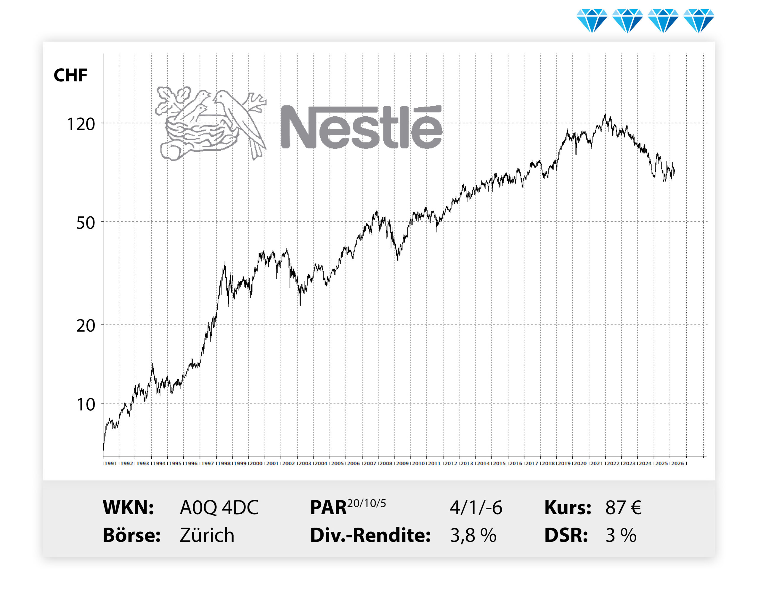 Alles in allem ist Nestlé in unseren Augen auf dem richtigen Weg, um in Zukunft wieder schneller zu wachsen und auch an der Börse dem langjährigen Ruf als zuverlässiges Basisinvestment wieder gerecht zu werden. Aktuell bekommt man die Aktie noch fast 40 Prozent unter Allzeithoch und mit fast vier Prozent Dividendenrendite!