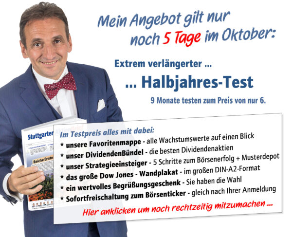 Ihre Vorteile: * Bis Ende Juli 2026 in Ruhe ausgiebig testen, anstatt sich gleich fest zu verpflichten. * Nur den Preis für 6 Monate zahlen, aber über 9 Monate dabei sein … * Unsere Favoritenmappe – für Sie im Testpreis mit dabei! Mit allen unseren Favoriten, die langfristig nur eine Richtung kennen – nach oben! * Unsere Dividenden-Mappe Wer zahlt die höchsten Dividenden, wer steigert Jahr für Jahr am stärksten, wer zahlt wann? * Unser Strategie-Einsteiger: 5 Schritte zum Börsenerfolg – mit unserem Musterdepot * Sonderdruck: Wandplakat im großen DIN-A2-Format – 40 Jahre Dow Jones * Börsentägliche Erreichbarkeit unserer Wachstums-Strategen per Telefon, von Mensch zu Mensch! * Internet-Sofortfreischaltung zu unseren Einschätzungen im täglichen Börsenticker
