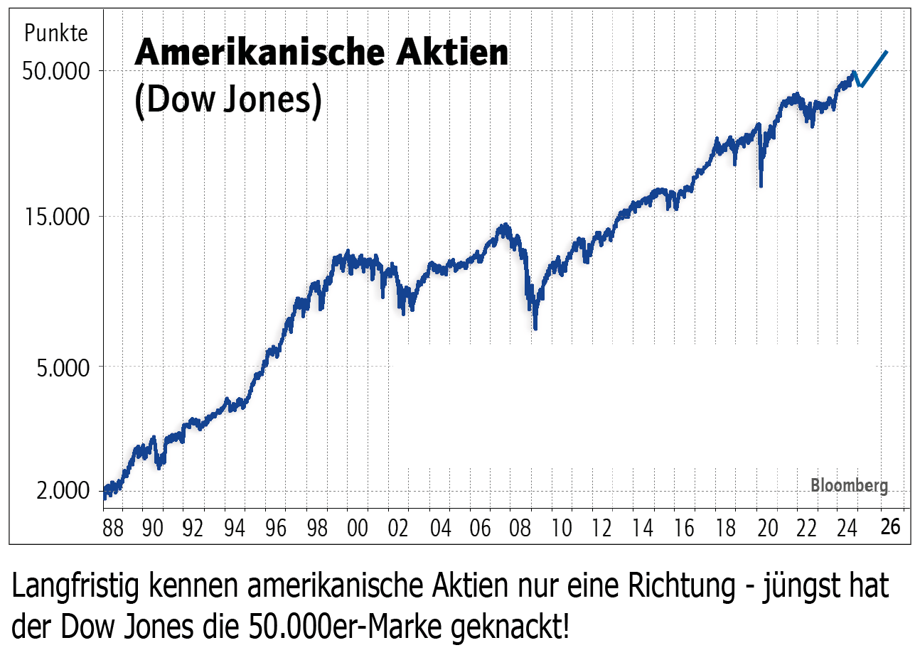 Wenn man kein geborener Glückspilz ist, muss man zumindest Daueranleger sein! Liebe Leserinnen und Leser, so schnell geht‘s: In der letzten Woche am Freitag hat der Dow Jones zum ersten Mal in seiner Geschichte die Marke von 50.000 Punkte übertroffen! Eine beeindruckende Zahl, die für …