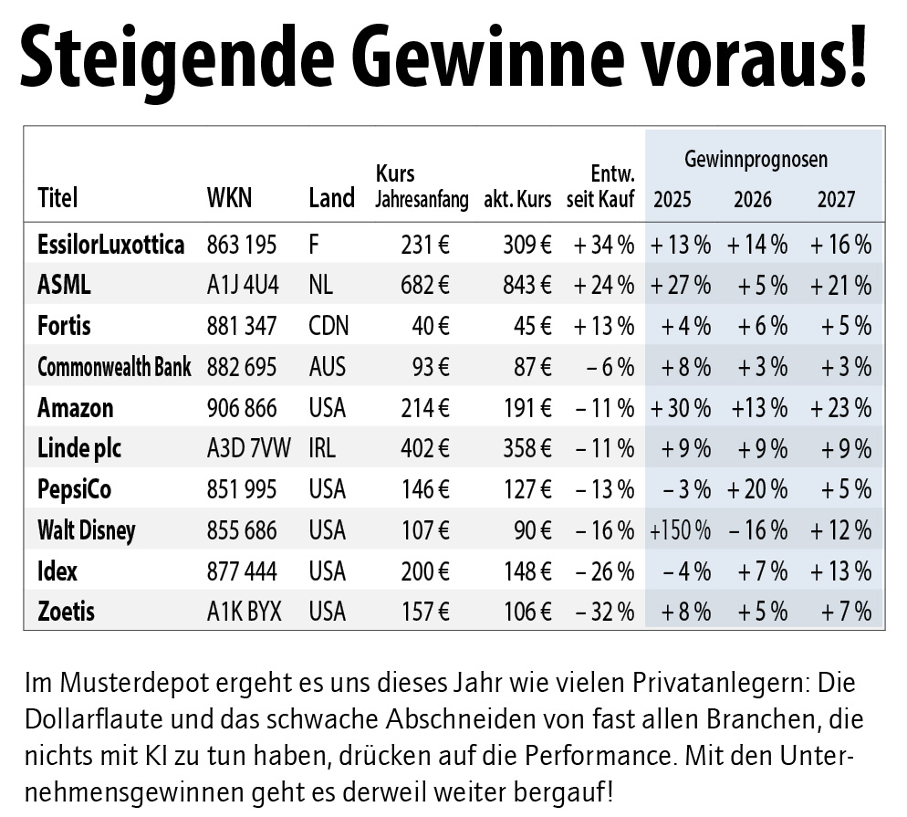 Seit der letzten Ausgabe haben viele unserer Musterdepotwerte zur Aufholjagd angesetzt. Angesichts der Perspektiven beim Gewinn sieht es ohnehin gut aus.