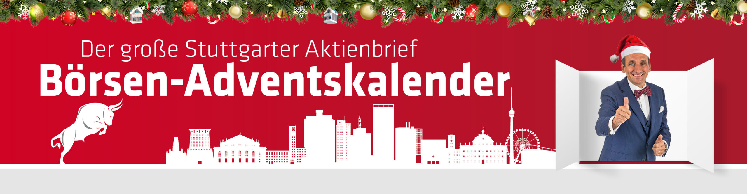 Der große Stuttgarter Aktienbrief Börsen-Adventskalender. Ab sofort dürfen Sie hier jeden Tag ein Türchen öffnen! Es erwarten Sie spannende Quizfragen, lustige Rätsel und viele weitere Überraschungen. Und das Beste: Unter allen richtigen Einsendungen verlosen wir täglich attraktive Gewinne! So wird das Warten aufs Christkind (oder ...