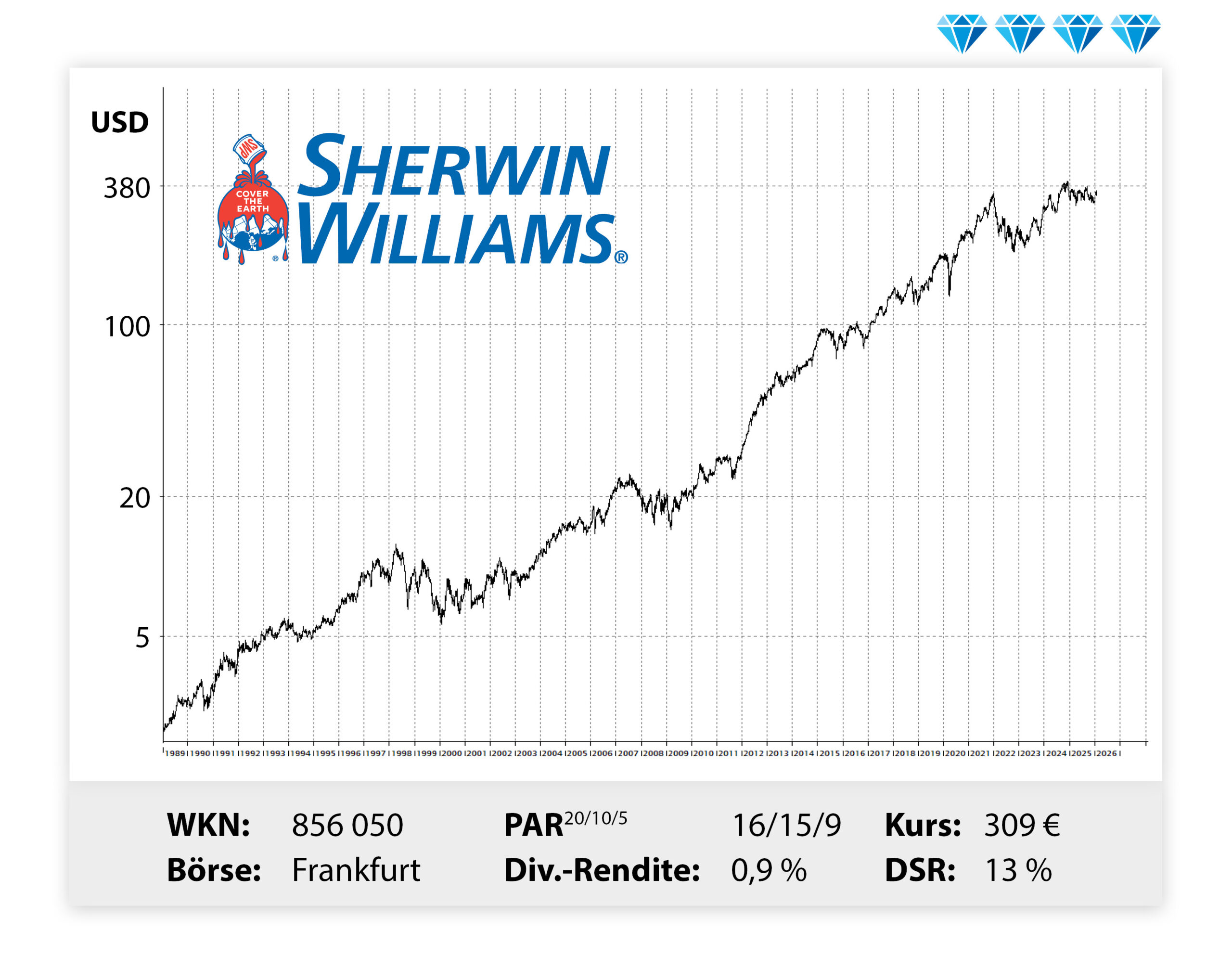Ausschüttung steigt weiter. Im Mai 2025 haben wir die Aktie von Sherwin-Williams in den Kreis unserer Wachstumswerte aufgenommen. Der US-Marktführer bei Farben und Lacken ist einer der (noch) eher unbekannten Titel im Dow Jones. Das liegt auch daran, dass die Aufnahme in den legendären Börsenindex …