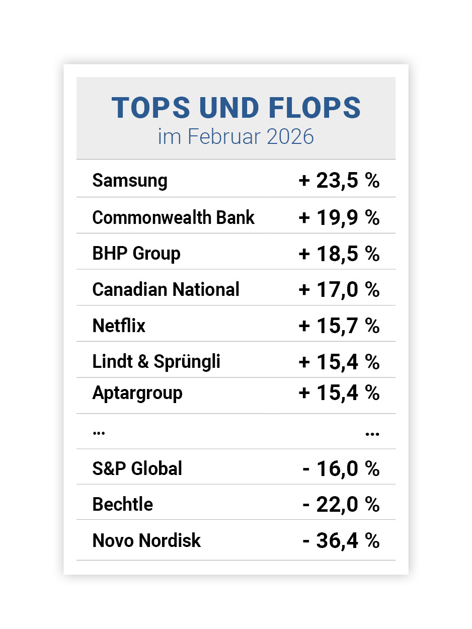 Der kürzeste Monat des Jahres ist Geschichte – und die Bilanz fällt überwiegend positiv aus. Fast drei Viertel unserer Wachstumswerte haben den Februar mit Pluszeichen abgeschlossen. Da sich die Kurse auf den letzten Handelstag des Vormonats beziehen, sind die Entwicklungen im Iran hier noch nicht …