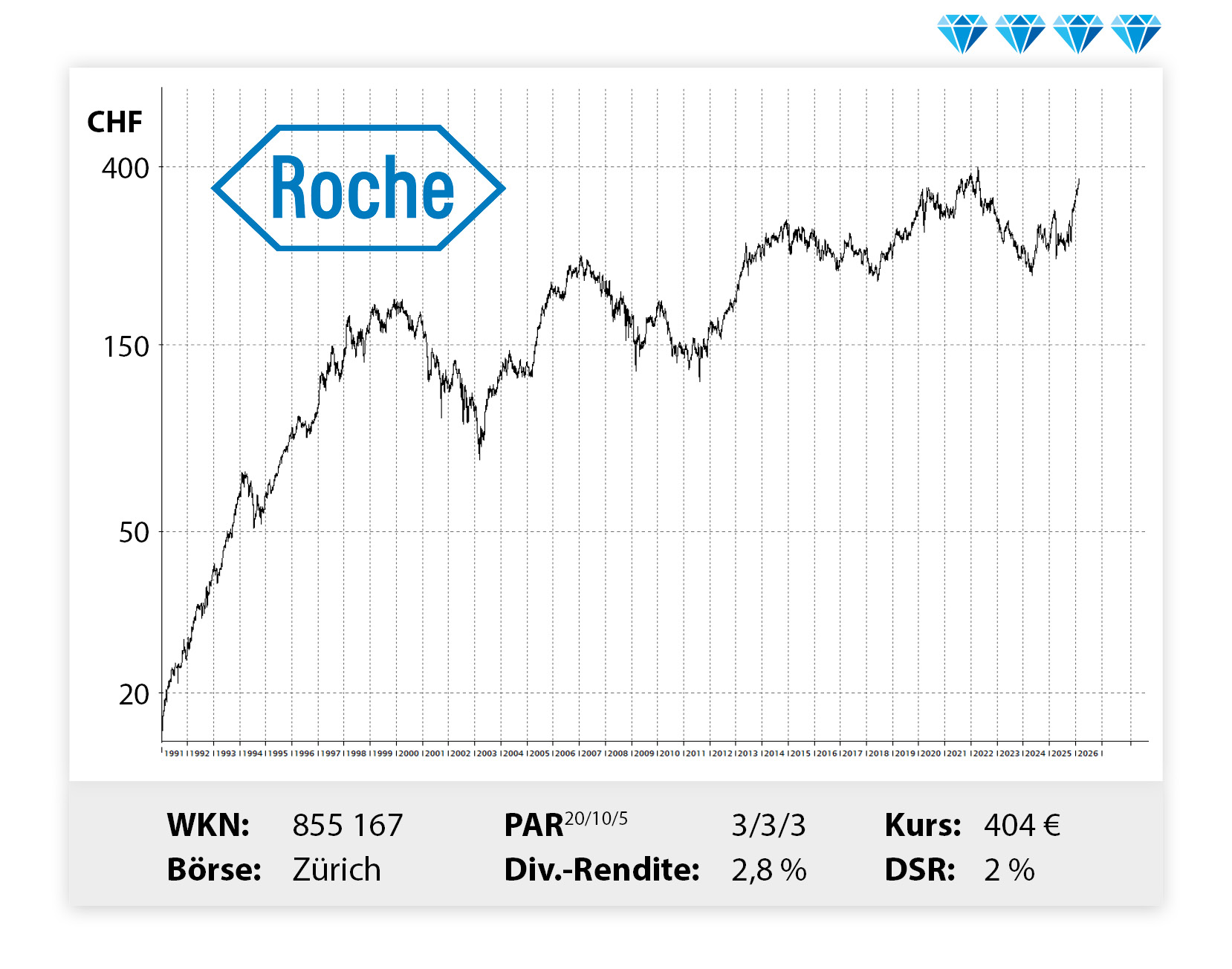Fast vier Prozent Dividende erleichtern das Warten auf höhere Kurse. Forschungsrückschläge und das Ende der Corona-Sonderkonjunktur bescherten der Roche-Aktie von 2022 bis Anfang 2024 eine herbe Talfahrt. Letztes Jahr nahm der Kurs dann bis in den Sommer hinein wieder gut Fahrt auf; seither ist aber …