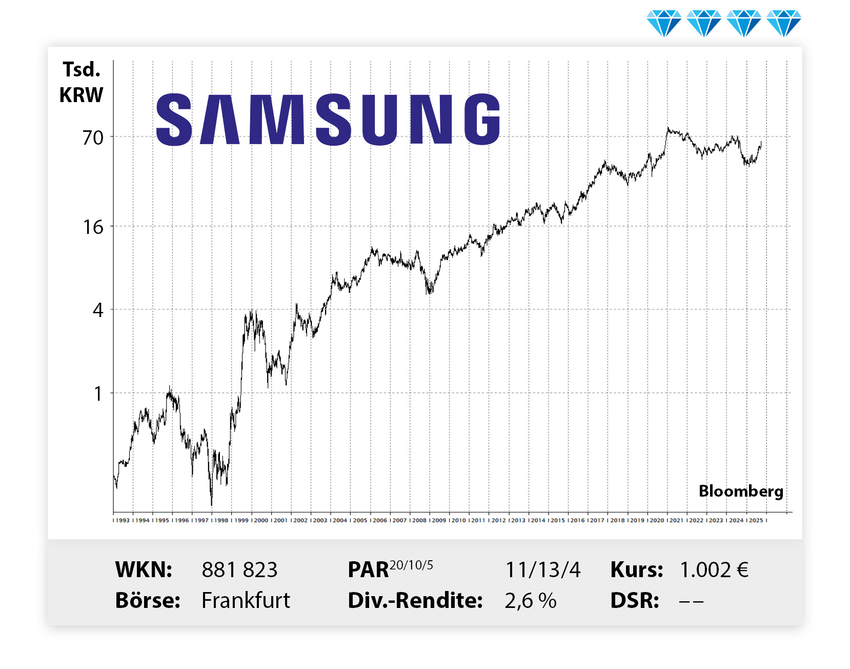 Aktie mit Trendumkehr? Dass bei Samsung nicht alles einwandfrei läuft, ist am Aktienchart durchaus abzulesen. Weiterhin belasten die Unabwägbarkeiten des Halbleitergeschäfts den südkoreanischen Elektronikriesen. Unser Wachstumskonzern ist bei den Speicherchips Weltmarktführer, muss aber innovativer werden, damit diese Position auch weiterhin gehalten wird. Darum soll Geld …